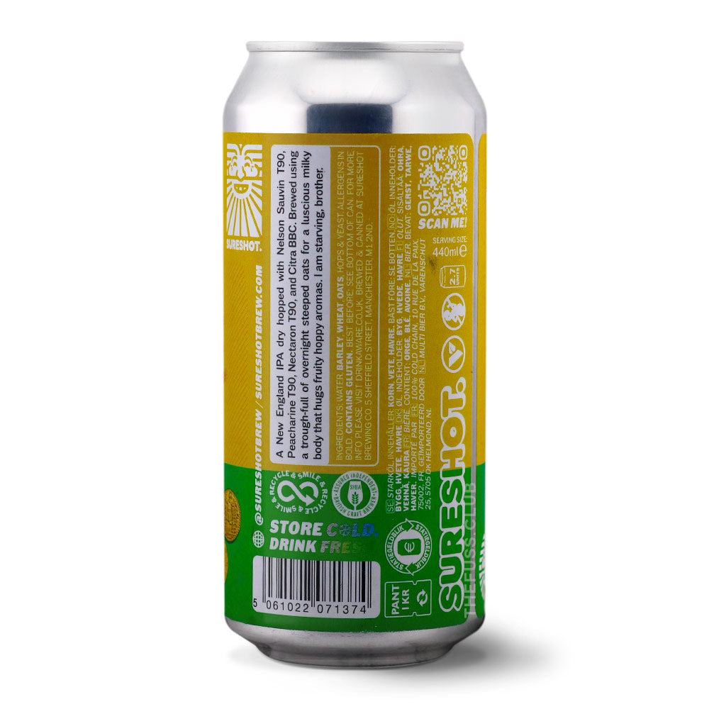 A New England IPA dry hopped with Nelson Sauvin T90, Peacharine T90, Nectaron T90, and Citra BBC. Brewed using a trough-full of overnight steeped oats for a luscious milky body that hugs fruity hoppy aromas. I am starving, brother.